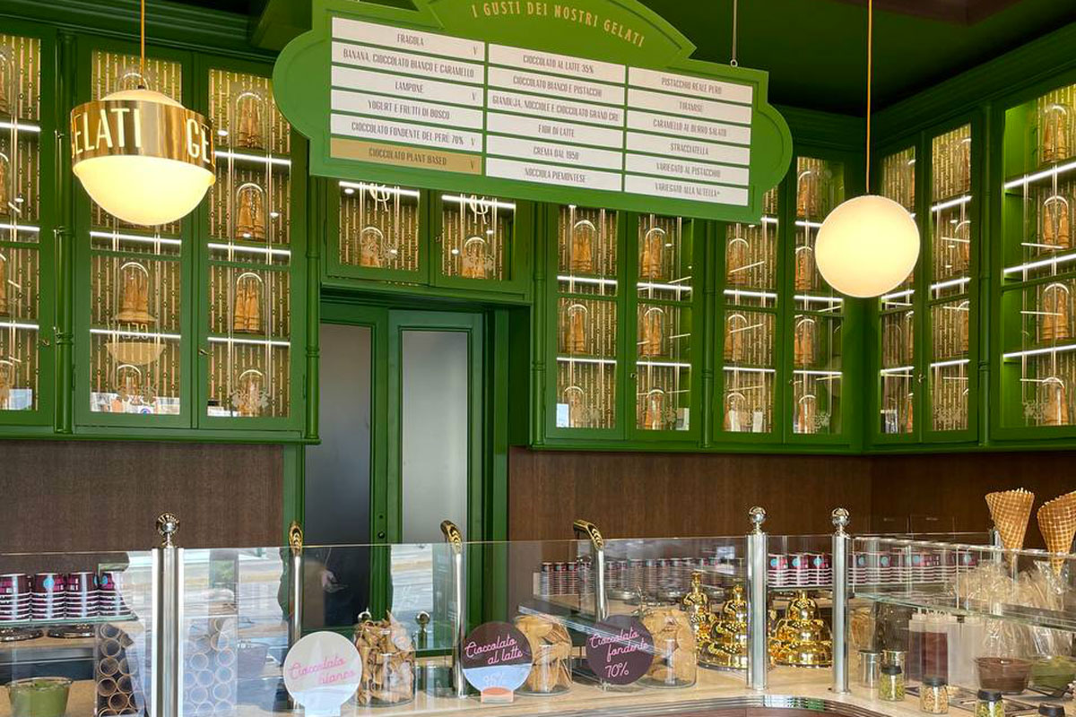 Nuove cromie, texture e attrezzature da banco all’avanguardia hanno creato un punto vendita elegante e performante, in perfetta sintonia con il marchio Cioccolatitaliani. Per i mobili, originariamente marroni, sono state scelte laccature verde brillante; le pareti sono state rivestite in tessuto; un grande mobile-vetrina, realizzato ad hoc e interamente custom, accoglie un’installazione di coni gelato disposti come un’opera d’arte contemporanea. Il nuovo bancone con top in marmo riprende le colorazioni originali e, grazie alla presenza dei riconoscibili coperchi in ottone delle vasche porta gelato, contribuisce a preservare la magia e la storia del luogo.
