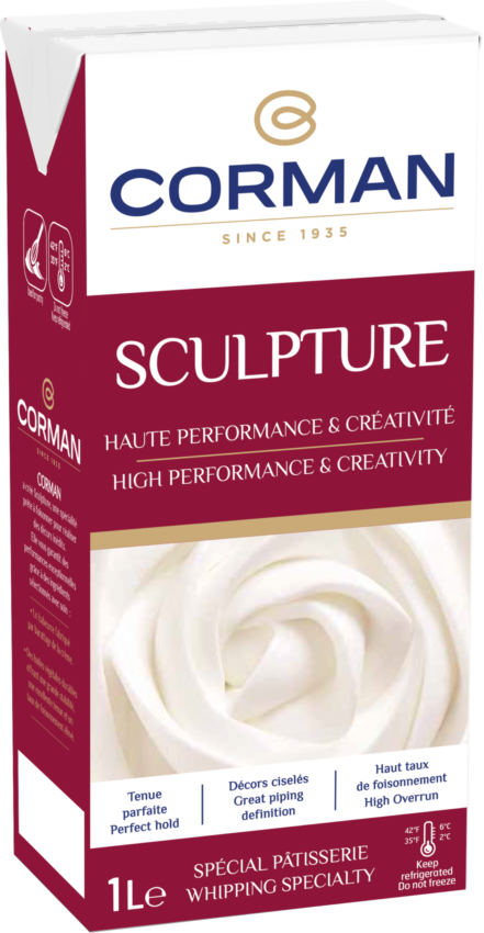 Fil rouge di queste ricette è Corman Sculpture 31% m.g., la specialità da montare che garantisce elevate prestazioni e creatività in pasticceria. Perfetta per l’incorporazione nel cremoso e impeccabile nella decorazione, conferisce un gusto fresco e delicato unico: infatti, è composta per il 69% da latticello ottenuto dal processo di zangolatura della panna e per il 30% da oli vegetali da produzioni sostenibili. Il risultato è un prodotto dalla consistenza liscia e ariosa, con una notevole resa in volume (oltre 3,4 volte il volume iniziale) e una potenza scultorea senza eguali!