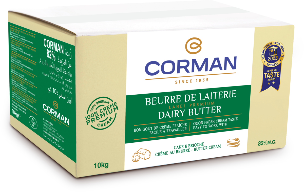 Tra le referenze da incorporazione, Burro di Latteria Corman 82% m.g. è la soluzione ideale per conferire ai prodotti finiti un buon gusto fresco lattiero-caseario distintivo e unico. Prodotto esclusivamente a partire da panna fresca Premium, è il più facile da lavorare tra i burri tradizionali: si incorpora e amalgama facilmente con gli altri ingredienti, garantisce gusto e texture regolari e costanti tutto l’anno. Le sue straordinarie caratteristiche organolettiche, che lo rendono ideale per la produzione di grandi lievitati – ai quali conferisce il suo piacevole e inimitabile gusto fresco, esaltando le componenti aromatiche degli altri ingredienti – hanno permesso a Burro di Latteria Corman di essere nuovamente premiato nel 2023 con la prestigiosa etichetta “Superior Taste Award”, un importante riconoscimento conferito dall’International Taste Institute che certifica la superiorità del prodotto.