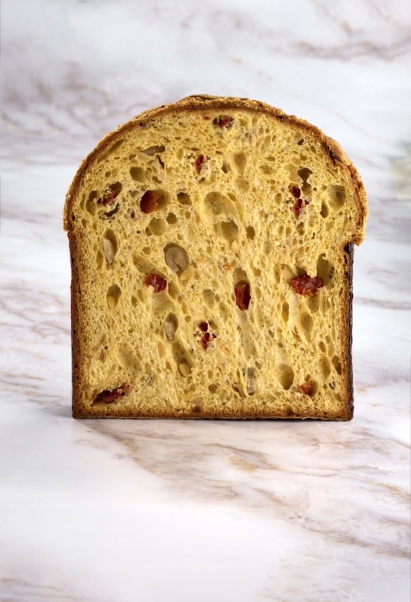 Infine, spostandoci lungo lo stivale, il Panettone My Sicily è una proposta salata in cui si sposano nell’impasto un pesto alla siciliana – a base di olio extra vergine d’oliva, pomodori di Pachino, mandorle dolci, tonno, parmigiano, basilico e aglio, oltre al cremoso Soft Style Cream Cheese Elle & Vire Professionnel® – con pomodori secchi, cipolla di Tropea e pinoli. Il panettone è poi guarnito con un crumble per lievitati salati realizzato con parmigiano e farina di mandorle, per un tocco croccante e saporito.
