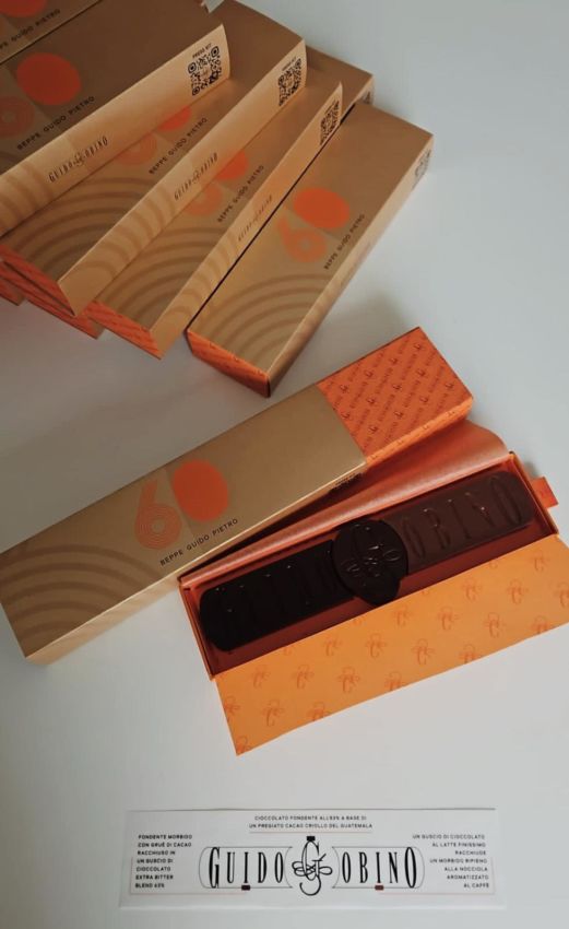 Per celebrare sessant’anni e tre generazioni di Cioccolato Gobino, l’azienda ha realizzato, in limited edition, una tavoletta di cioccolato che riproduce il logo dell’azienda, divisa in tre parti che sarà presto disponibile nelle botteghe: “GUIDO” un Fondente morbido con gruè di cacao racchiuso in un guscio di Cioccolato Extra Bitter Blend 63%, la “G” centrale al Cioccolato Fondente all’83% a base di un pregiato cacao Criollo del Guatemala e, infine, “OBINO” un guscio di Cioccolato al Latte finissimo che racchiude un morbido ripieno alla nocciola aromatizzato al caffè.