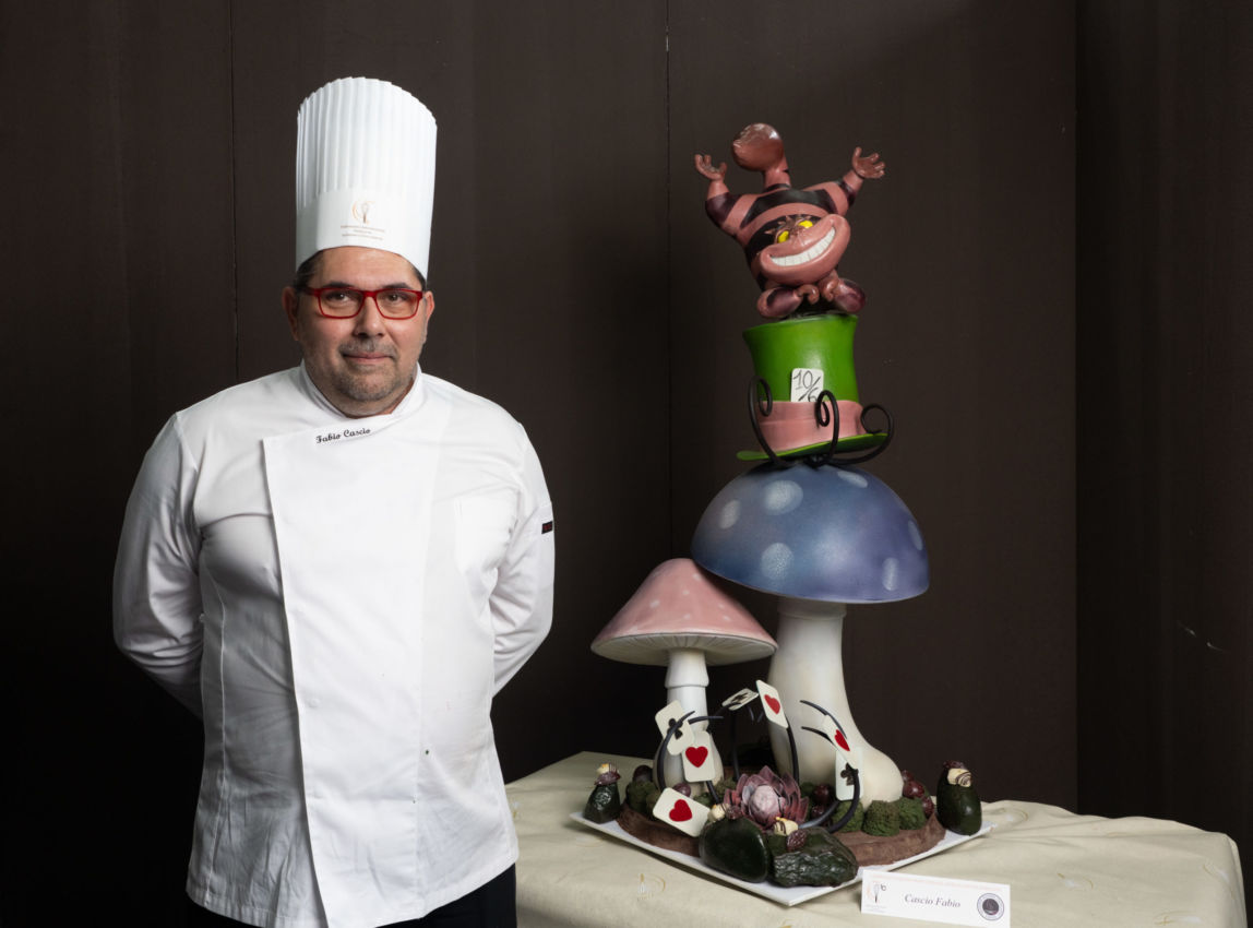 Fabio Cascio, pasticciere di Cento, Ferrara, ha stupito la giuria e conquistato l’oro con una pièce in cioccolato che raffigura il celebre stregatto di Alice nel paese delle meraviglie. L’opera, colorata con burro di cacao e sviluppata in altezza, ricrea il cappello del Cappellaio Matto e le ambientazioni magiche della fiaba in maniera equilibrata e leggera.