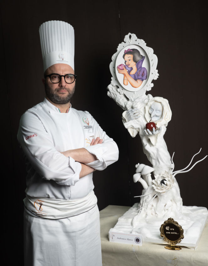 Marco Andronico trionfa nella categoria ‘Pastigliaggio e monoporzione moderna’. Originario di Sannicola, Lecce, fa rivivere la fiaba di Biancaneve con una rappresentazione allegorica. Da un tronco sinuoso realizzato in pastigliaggio colato, la Strega Grimilde offre la mela avvelenata, una gustosa monoporzione servita sullo specchio magico. Ad essere premiati l’attenzione minuziosa ai dettagli e l’equilibrio di tutti gli ingredienti al palato.