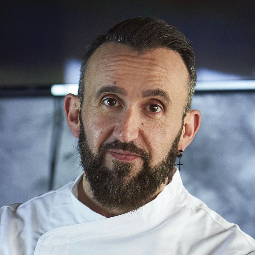Partite dalla base sablé, già cotta e lasciata raffreddare. Temperate il cioccolato al latte e bagnate con un velo fine la base sablé al suo interno, lasciando cristallizzare. Ripetete la stessa operazione rovesciando la base sablè, bagnandola con una pistola ad aria, per una texture rugosa. Lasciate raffreddare. Pitturate la base con il burro di cacao blu, dando un tocco extra d’argento in polvere con un pennello dalla punta fine. Anche in questo passaggio, lasciate raffreddare la base. Trascorso il tempo necessario, iniziate ad assemblare l’interno del dolce, cominciando dal pan di spagna già bagnato con lo sciroppo di yuzu. Aggiungete la crema allo yuzu, riempiendo la base fino alla metà. Aggiungete la gelè in dadi al centro. Terminate con la bavarese di vaniglia Tahiti e lasciate assestare il tutto. Infine, aggiungete un velo di glassa al cioccolato bianco e decorate con una quenelle di bavarese alla vaniglia.