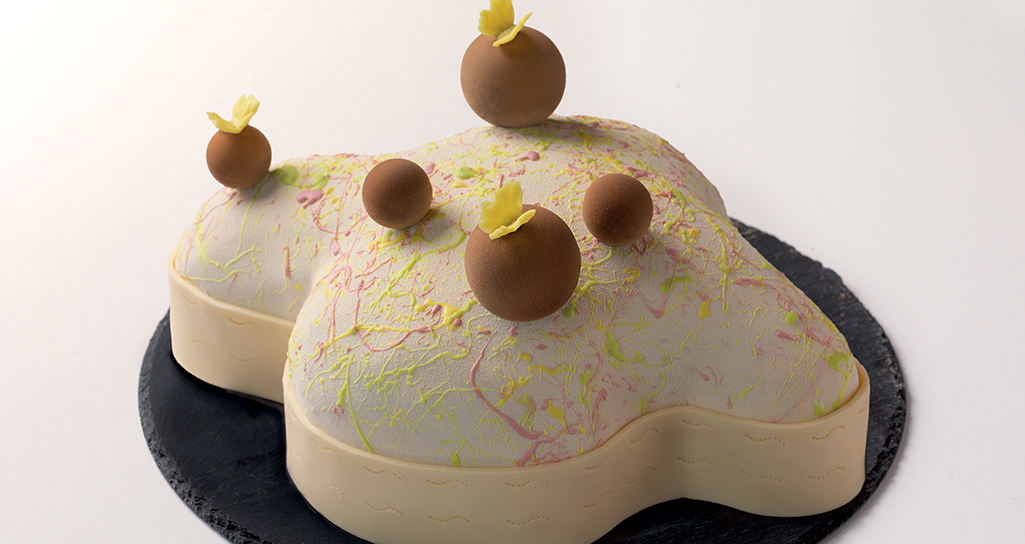 Stuccate la colomba con la crema al burro e glassatela. Spruzzatela con la massa a spruzzo bianca. Decorate con burro di cacao con colorante verde, sfere di cioccolato e farfalle in pasta di zucchero