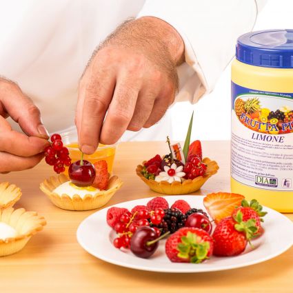 Utilizzando un sac-a-poche con bocchetta liscia guarnire il centro delle “margherite” con la crema mousseline all’Ananas cercando di dare una bella forma bombata di semisfera. Glassare tutta la frutta fresca rossa di guarnizione con la glassatura Fruttapiù Limone Dia e decorare le crostatine con granella di pistacchio e decorazioni a piacere.