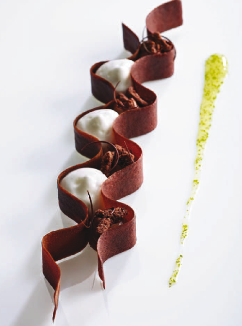 Mettere due tegole in un piatto liscio. Con una tasca munita di una bocchetta di 10 mm di diametro, dressare tre palline da 10 g di cremoso al cioccolato avendo cura di lasciare lo spazio di un’onda tra ciascuna pallina. Depositare in seguito 10 g di streuzel al cioccolato sulle palline di cremoso. Con un cucchiaio per minestra, aggiungere po’ di gelatina alla menta–limone in parallelo sul dessert e negli spazi tra i cremosi. Per finire, con un sifone, dressare la spuma di menta riempiendo gli spazi liberi tra le due tegole. Decorare con le ciglia di cioccolato. Servire subito.