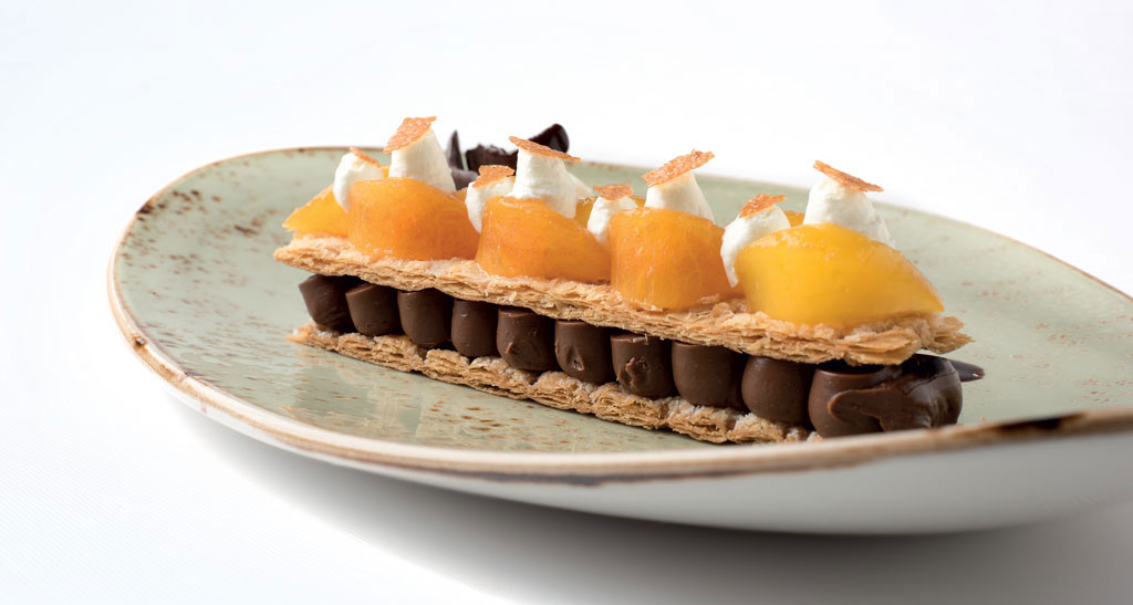 Disponete con un sac-à-poche il cremoso su di un rettangolo di sfoglia, aggiungete un po’ di croccante di cioccolato, gruè di cacao e coprite con un’altra sfoglia. Distribuitevi al di sopra gli spicchi di pesca e decorate con ciuffi di Panna Prima Blanca Debic montata e frammenti di croccante al gruè. Adagiate sul piatto un piccolo scodellino ottenuto con del cioccolato temperato e ponetevi all’interno il sorbetto alla pesca. Decorate il piatto con salsa di cioccolato e amaretto sbriciolato.
