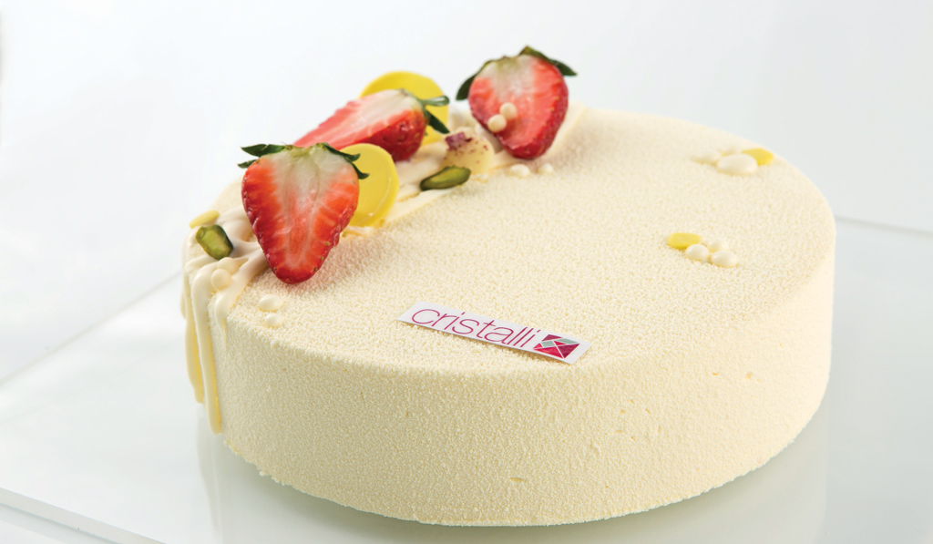 Dressate 120 g di cremoso sul pan di Spagna e congelate. Versatevi sopra 190 g di fragole e 70 g di essenza e fate gelificare in frigorifero. Estraete dallo stampo e montate su un cerchio da 18 cm rivestito con acetato, quindi colate 300 g di panna cotta leggera e fate raffreddare. Smodellate, spruzzate con un sottile strato di cioccolato bianco diluito con un 30% di burro di cacao e decorate.