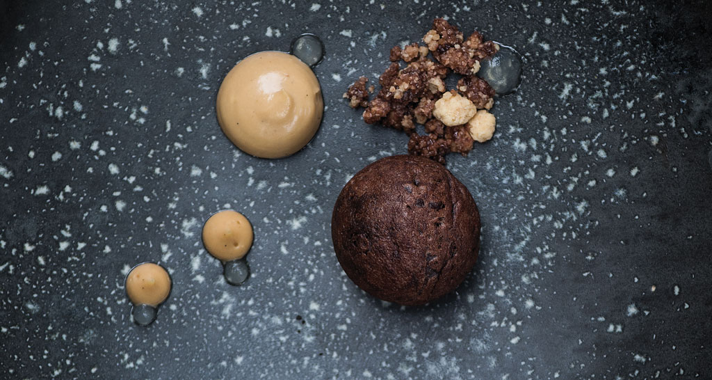 Nel piatto disponete la crema nocciola, il gel di arancia e limone canditi, il panettone croccante e il canederlo.