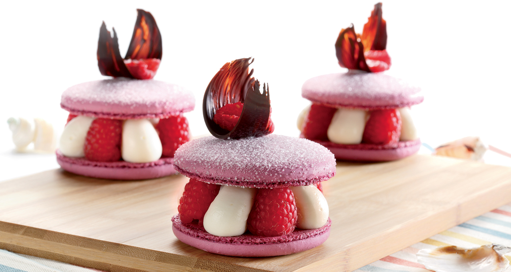 Scaldate l’acqua fino ad una temperatura di 50 °C e unite il Patis’Macanoisette, mixando per 4 minuti a velocità massima. Mettete l’impasto dei macaron su due tappeti in silicone antiaderenti, spolverizzarli con lo zucchero cristallizzato e cuoceteli a 150 °C per 20 minuti in forno statico.