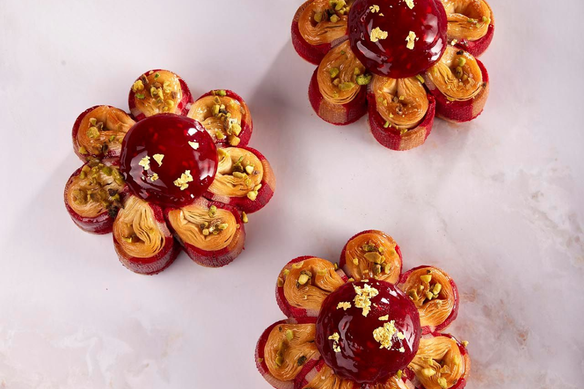 Laminate i tre pezzi di pasta separatamente a 5 mm e posizionateli uno sull’altro. Laminate la pasta bianca a 10 mm. Tagliate delle strisce di pasta colorata da 10 mm e distribuite per il verso lungo fino a coprire l’intera pasta bianca. Riponete su teglia e lasciate in congelatore per 10/15 minuti, quindi laminate a 2 mm. Utilizzando uno stampo a margherita, coppate il fondo del dolce, poi ritagliate delle strisce di pasta da 3 cm per 8,5 cm e richiudete, con la parte bianca all’interno, per formare i petali da inserire nello stampo. Mettete a lievitare in cella per 2 ore circa a 26°C. Cuocete a 175°C per 20 minuti. Una volta cotta e raffreddata, lucidate con gelatina a freddo e decorate con cupola al lampone.