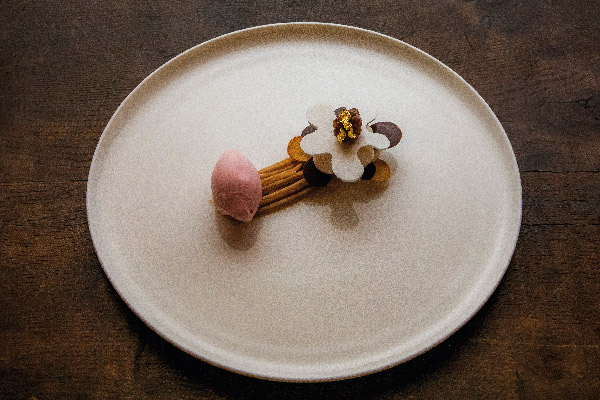 Dessert Mont Blanc di Francesca Benedettelli: piatto con gelato rosa e decorazione floreale.