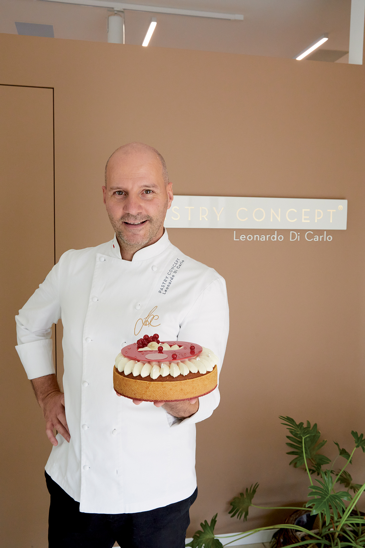 abbattitore con ciclo positivo a +3°C, fino a raggiungere +20°C al cuore. Una volta raffreddato, montate in planetaria con la frusta il cremoso alla fava Tonka fino a consistenza da sacchetto. Con l’aiuto di una sac à poche con bocchetta Saint Honoré decorate la superficie. Terminate con un disco di cioccolato bianco colorato di rosso, quindi ribes e foglia argento. Conservate a +4°C e consumate entro 2 giorni.