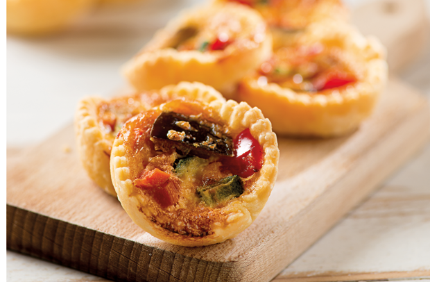Preparate un soffritto con cipolle e olio extravergine d’oliva; aggiungete le verdure tagliate a cubetti regolari, cuocete per 5 minuti (dovranno essere solamente scottate, la cottura la termineranno in forno con la quiche), sale e pepe. Emulsionate la panna con le uova, i tuorli e il formaggio grattugiato, salate e pepate. Montaggio Foderate stampi rotondi del diametro 4 cm (altezza 2 cm) con pasta brisée tirata allo spessore di 3 mm. Disponete sul fondo le verdure soffritte fredde e riempite con la crema di panna e uova. Cuocete a 185°C per 15-18 minuti.