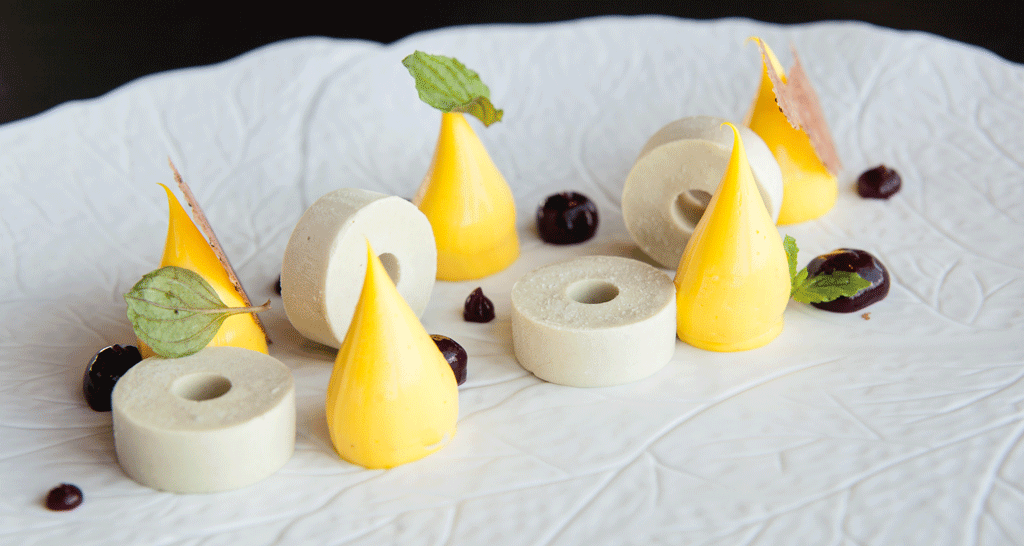 Con un sac-à-poche realizzate 5 spuntoni con il cremoso allo zafferano su ogni piatto. Intercalate 4 semifreddi al pistacchio e decorate con delle gocce tonde di varia misura, cialda croccante ed erbe officinali.