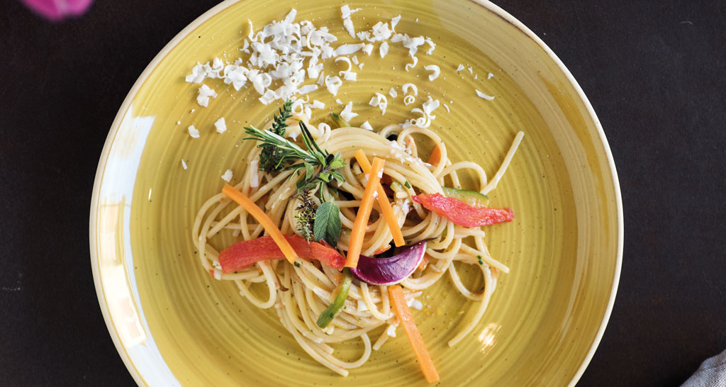 Mondate le verdure, tagliatele a julienne e fatele stufare con dell’olio, quindi aggiustate di sale. Cuocete la pasta in abbondante acqua salata, scolatela e conditela con le verdure e le erbe aromatiche. Impiattate e servite spolverizzando con una grattugiata di ricotta salata.