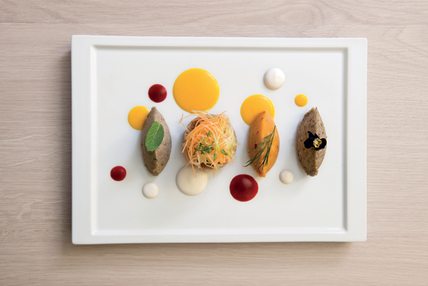 Paté di patate peruviane e pelatura di rape, paté di ceci e bucce di carota e paté di borlotti, bucce e semi di zucca, realizzati con miele di Eucalipto e serviti con insalata di germogli, crudità e polline, accompagnati da blinis di grano saraceno.