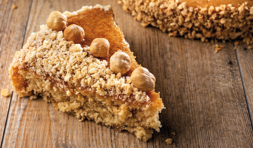 Sfornate la torta, ricopritela con uno strato di gelatina neutra, spolverizzate per metà con granella di nocciole e decorate a piacere con nocciole intere.