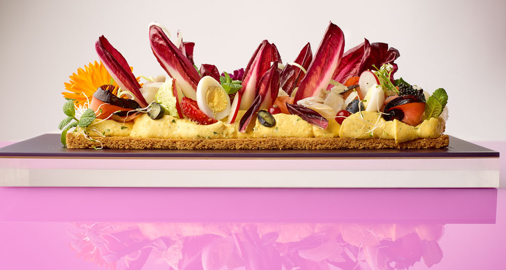 Con sac-à-poche disponete la crema sopra la sableé. Decorate il cake a piacere con: salmone affumicato, pesce spada affumicato, tonno affumicato, caviale, bottarga, radicchio rosso, porro, indivia, lamponi, ribes, pomodorini ciliegia.