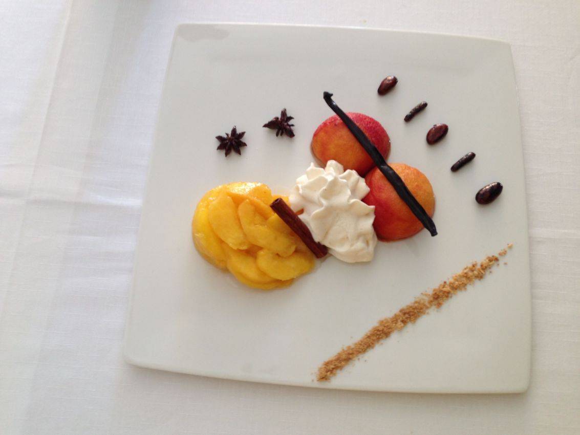 Tagliate una pesca a metà,togliete il nocciolo e cuocete in forno a 160 °C per circa 5 minuti con la pelle rivolta verso l’alto. Spellate l’altra pesca, priivatela del nocciolo e tagliatela a fettine. Adagiatela in uno stampino d’acciaio. Fate bollire 100 ml di acqua con zucchero e cannella, lasciate raffreddare e scioglietevi i 2 fogli di gelatina precedentemente ammollati. Versate il tutto nello stampino con la pesca e lasciate raffreddare . In una pentola preparate il caramello con acqua , zucchero e limone. Quindi passatevi la stecca di cannella, la stecca di vaniglia, l’anice stellato e le fave di cacao. Lasciatele raffreddare sulla carta da forno. Tritate finemente l’amaretto. In un sifone versate gli albumi, lo zucchero e l’amaretto. Agitate bene e caricate due bombolette. Lasciate raffreddate. Posizionatele pesche cotte al forno in un piatto bianco, girate lo stampino con la pesca in gelatina. Decorate con la cannella, la vaniglia, l’anice stellato e le fave di cacao caramellate. Agitate il sifone e versate la spuma di amaretto fra le pesche.