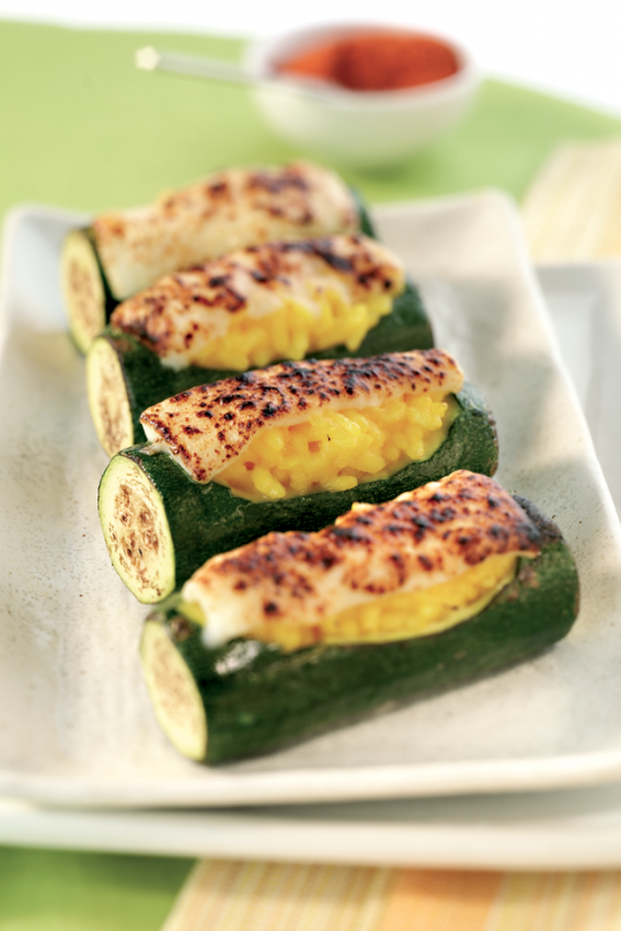 Tritate finemente lo scalogno e stufatelo in casseruola con il burro fino a renderlo trasparente. Unite il riso e tostatelo a fiamma vivace per 1 minuto; sfumate con poco brodo e proseguite la cottura aggiungendone altro man mano che il risotto asciuga. Dopo 5 minuti unite lo zafferano e aggiustate di sale e pepe. Mantecate a fine cottura con 100 g di pecorino grattugiato. Tenete da parte e lasciate intiepidire. Lavate le zucchine, spuntatele e sbollentatele per 3 minuti (oppure cuocetele al vapore per 5 minuti); togliete quindi la polpa con uno scavino. Riempite le zucchine con il riso pressandolo bene e fate raffreddare. Tagliate a strisce il restante pecorino e mettetelo sopra al riso. Grigliate le zucchine sotto al grill del forno per 3-4 minuti e condite poi con poco olio. Servite subito ben caldo. Per mantecare un risotto distribuite a fuoco spento su tutta la superficie del riso il formaggio grattugiato e iniziate a mescolare per 1 o 2 minuti. A mantecatura completata il risotto dovrà presentarsi un po’ liquido, con i chicchi al dente e ben separati l’uno dall’altro.